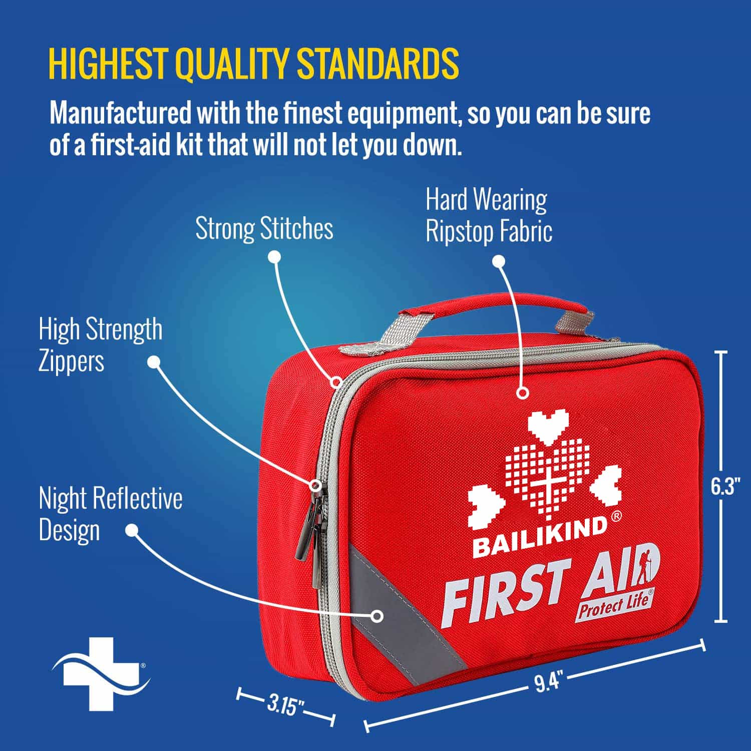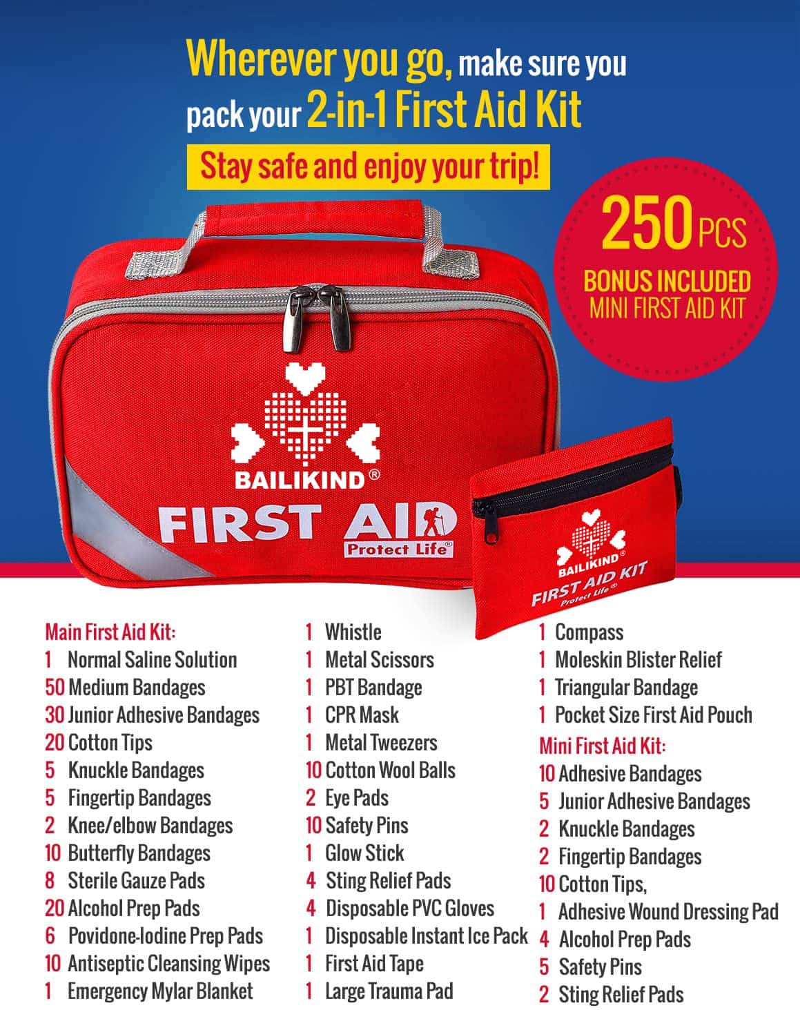 Uphawu lwe-2-in-1 First Aid Bag yeMoto: EDURABLE & COMPACT (9.4" x 6.3" x 3.15", inobunzima obuyi-1.46 pounds kuphela). Yomelele kwaye kulula ukuyiphatha, kodwa iphethe zonke izinto ezisisiseko zoncedo lokuqala kunye nezinto zokulungela. kunye nekiti encinci yebhonasi Icwangciswe kakuhle kunye namacandelo amaninzi kwaye kusekho indawo eyongezelelweyo yokongeza izinto xa kuyimfuneko.