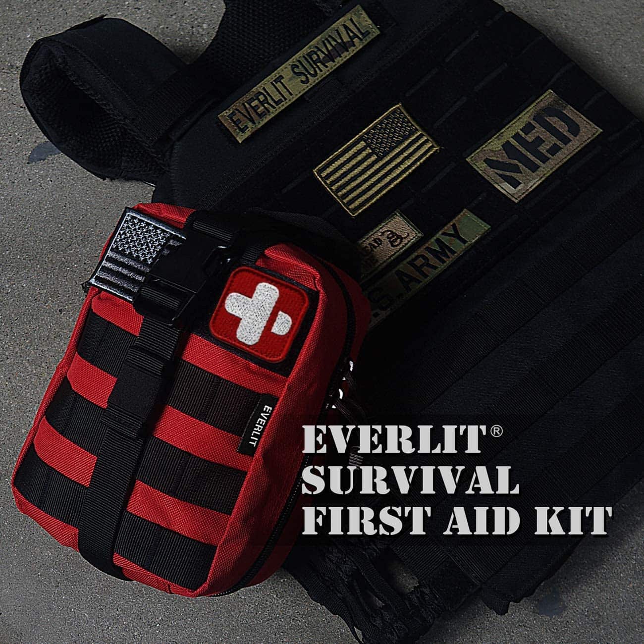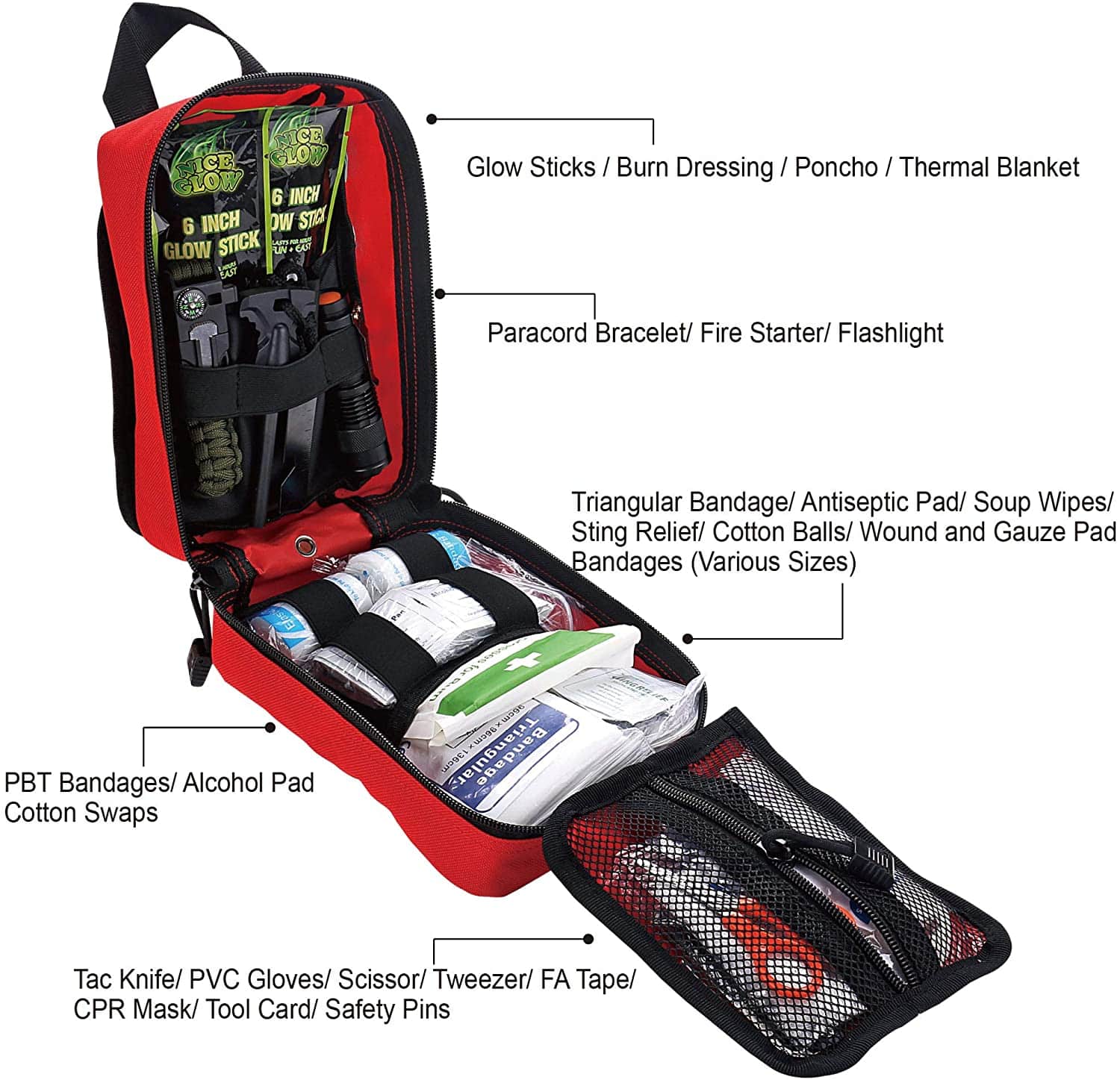 Uphawu lwe-Red Survival First Aid Kit Iqulethe i-250 Piece First Aid Kit: ibhegi ye-EMT yomgangatho womkhosi yenziwe nge-1000D enayiloni enganyangekiyo emanzini, inika amagumbi amakhulu amathathu kunye namagumbi amaninzi okongeza izixhobo zakho. Umyinge opheleleyo wekhithi yi-8’’ x 6.5’’ x 5’’ kunye nobunzima be-1.9 lbs kuphela. Imitya ehambelana ne-molle ngasemva ivumela umsebenzisi ukuba ayiqhoboshele kwezinye iingxowa okanye ibhanti lakho, elenza libe liqabane eligqibeleleyo kuyo nayiphi na imisebenzi yangaphandle.